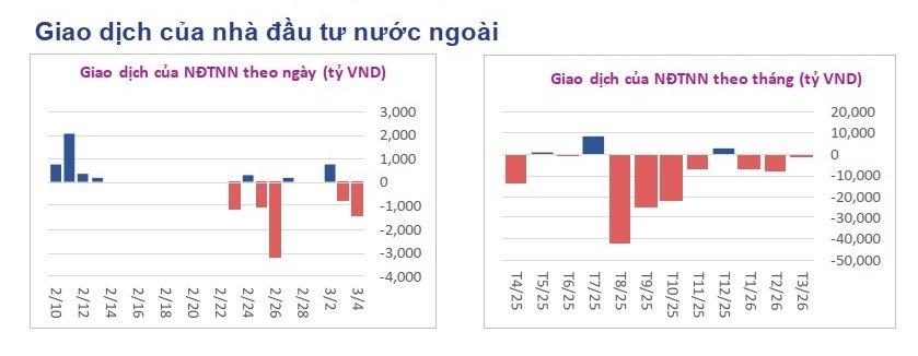 - Trong tháng 2/2026, khối ngoại tiếp tục đà bán ròng cổ phiếu với tổng giá trị là -8.006 tỷ đồng. Và trong những ngày đầu tháng tháng 3/2026, khối ngoại tiếp tục bán ròng -1.392 tỷ đồng. Luỹ kế từ đầu năm 2026 đến nay, khối ngoại đã bán ròng với tổng giá trị là -15.830 tỷ đồng. Trong phiên giao dịch sáng nay, khối ngoại đang bán ròng -1.376 tỷ đồng.