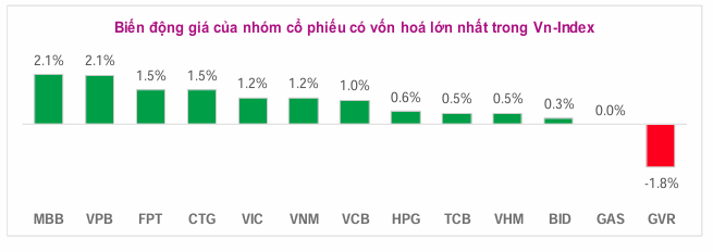 - Phiên giao dịch sáng ngày 31/03/2026, chỉ số Vn-Index đang tăng điểm ở mức trung bình, tuy nhiên số lượng mã tăng giá không nhiều. So với phiên giao dịch ngày hôm trước, Vn-Index tăng 11,10 điểm, và đang vận động trên đường trung bình 10 ngày. Trong số các mã cổ phiếu trụ có vốn hoá lớn nhất trong Vn-Index, một số mã cổ phiếu đang có mức tăng giá mạnh là: VCB(+1,0%), FPT(+1,5%), CTG(+1,5%), VIC(+1,2%), VPB(+2,1%), VNM(+1,2%), MBB(+2,1%), trong khi đó mã cổ phiếu đang có mức giảm giá mạnh là: GVR(-1,8%).